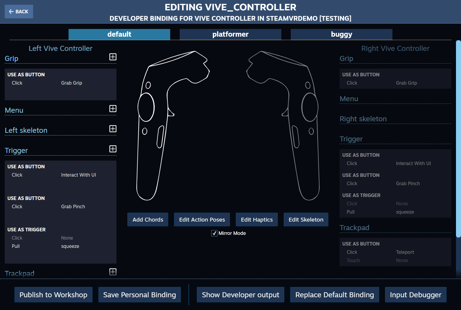 Valve의 Vive를 통해 개발했는데, 오브젝트를 잡는 기능을 구현하려 Personal Controller Binding을 진행했다.