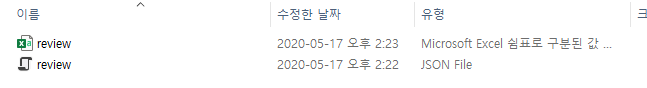 파일 - 다른 이름으로 저장을 선택 후 파일 이름은 'review.json', 파일 형식은 모든 파일로 저장한다.