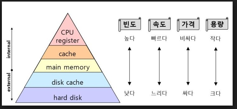 • 속도가 빠른 저장장치는 용량이 작고 비싸다.