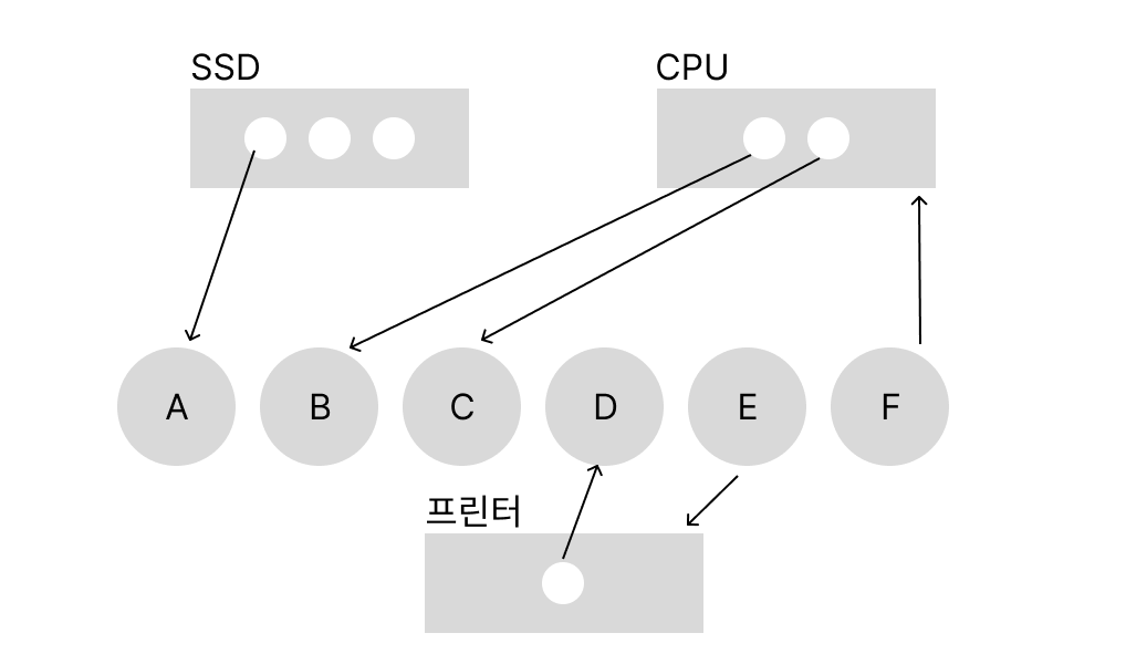 - 프로세스가 사용중인 자원은 점에서부터 프로세스를 향해 화살표 표시