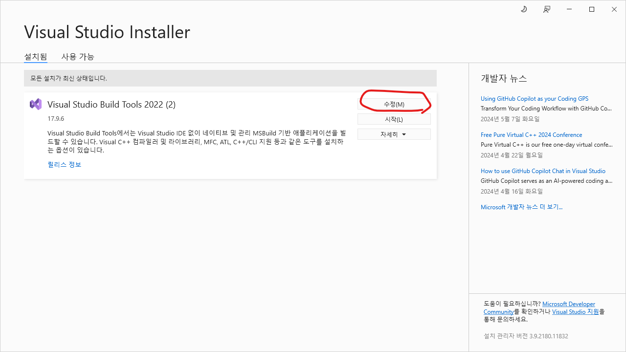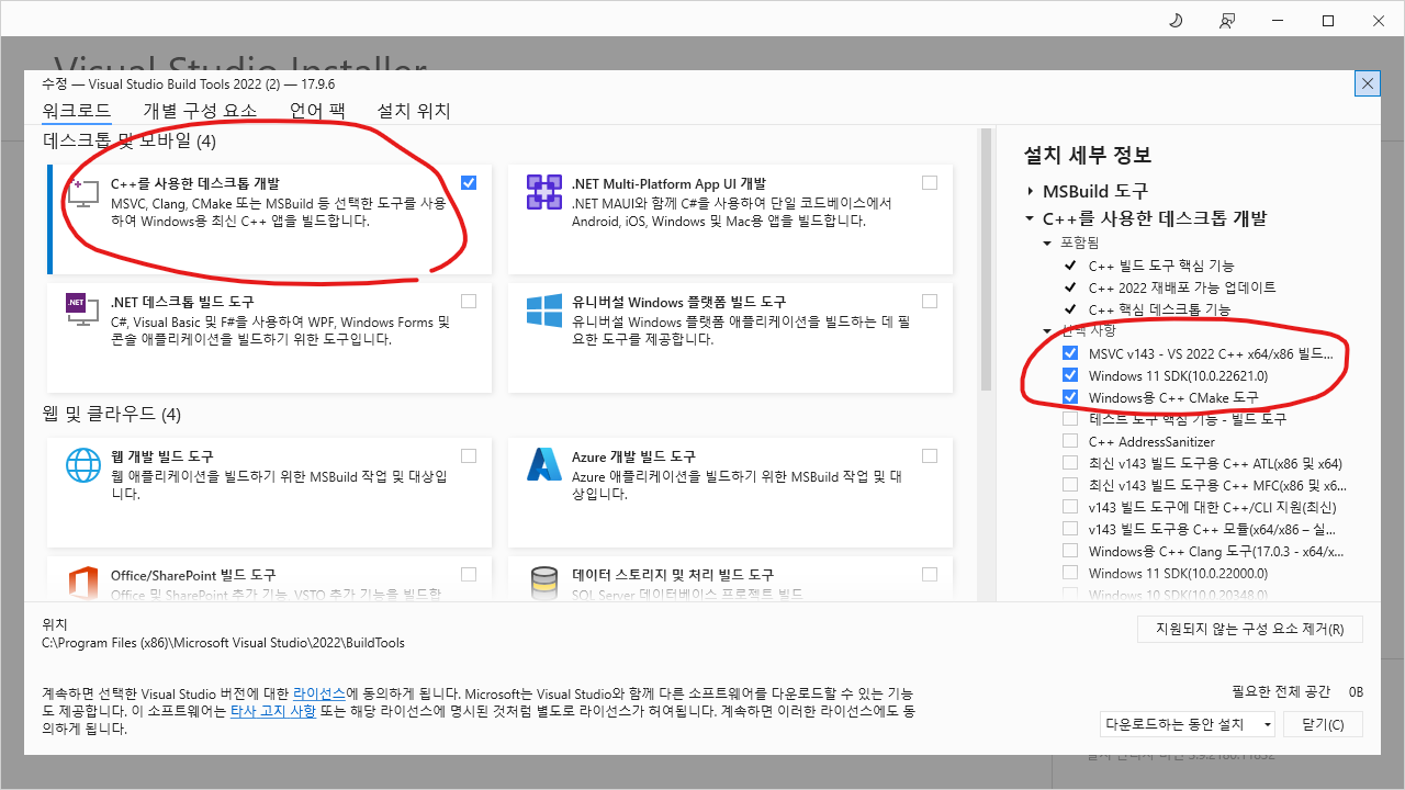 C++를 사용한 데스크톱 개발 -> 우측에 세 개를 체크 후 우측 하단의 수정 버튼을 누르면 된다.